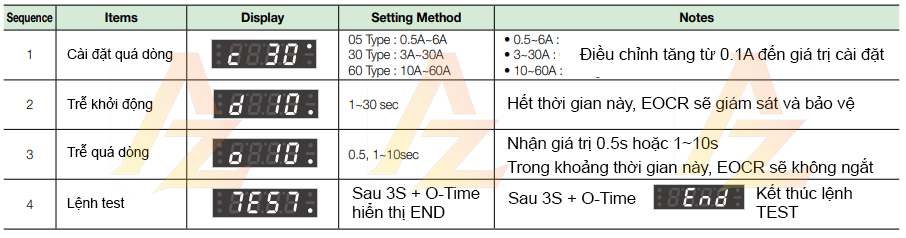 - Tính năng bảo vệ quá dòng sẽ được kích hoạt khi dòng của động cơ vượt quá dòng cài đặt trên EOCR sau quãng thời gian O-TIME.