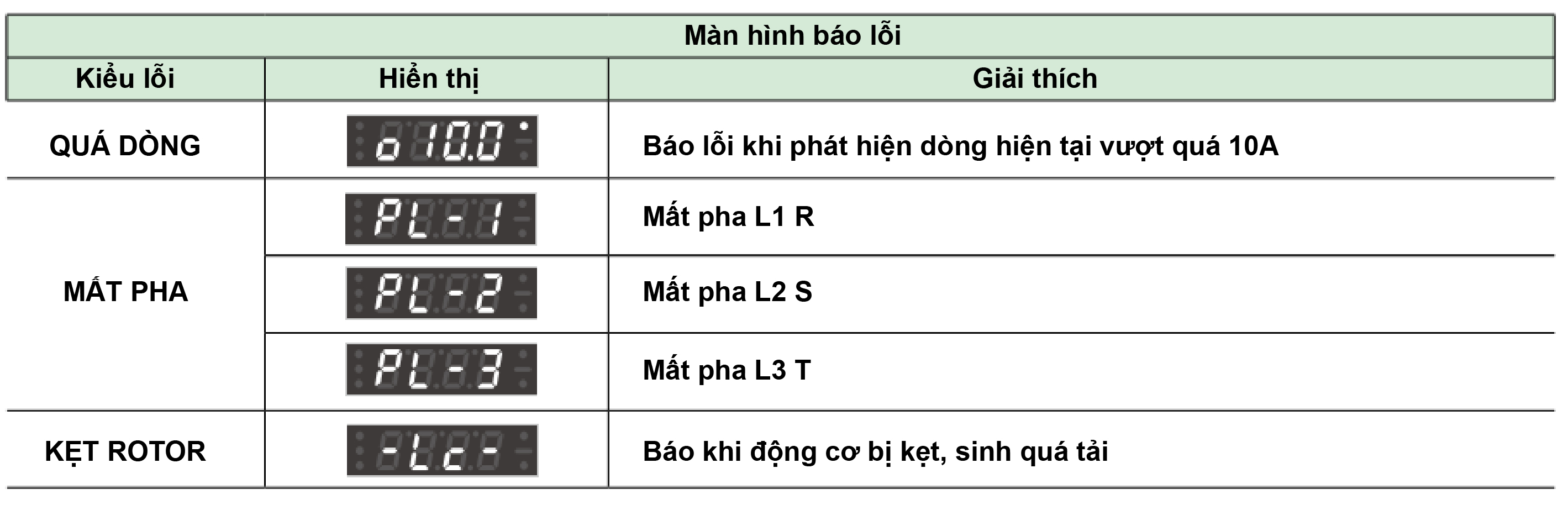 - Khi xảy ra sự cố mất pha hoặc kẹt Rotor tải đầu ra, dòng tiêu thụ của động cơ có thể vượt quá 150% hoặc hơn thế so với mức thông thường, động cơ sẽ sinh nhiệt, gây thiệt hại.