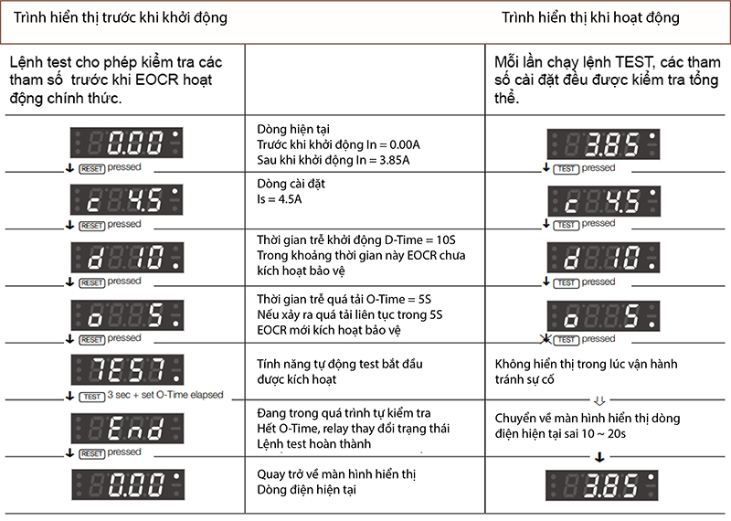 - Chỉ thị LED sẽ sáng liên tục khi xảy ra hiện tượng quá tải, cho đến khi sự cố được khắc phục và EOCR được Reset.