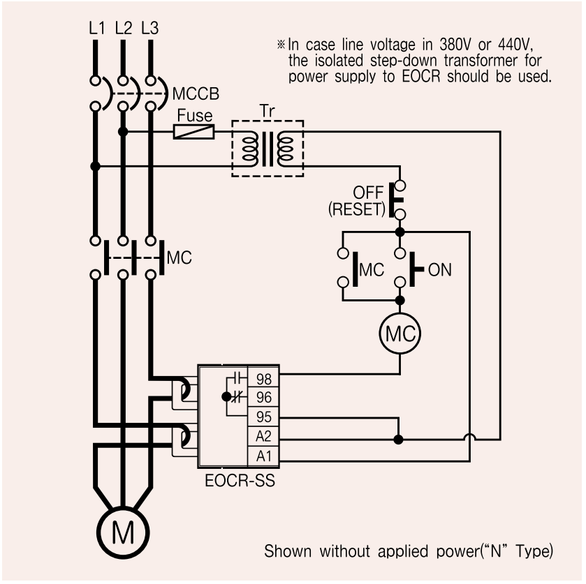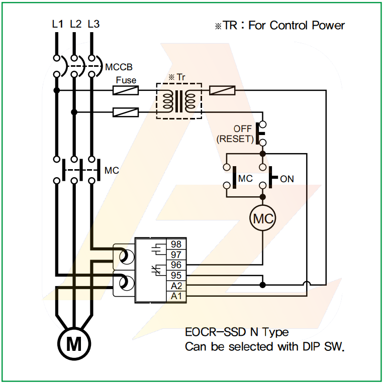 - N TYPE: EOCR chuyển đổi trạng thái ngay sau khi cấp nguồn: 95-96 NC => NO | 97-98 NO => NC, Khi xảy ra sự cố, EOCR lại thay đổi trạng thái, trở về lúc đầu.