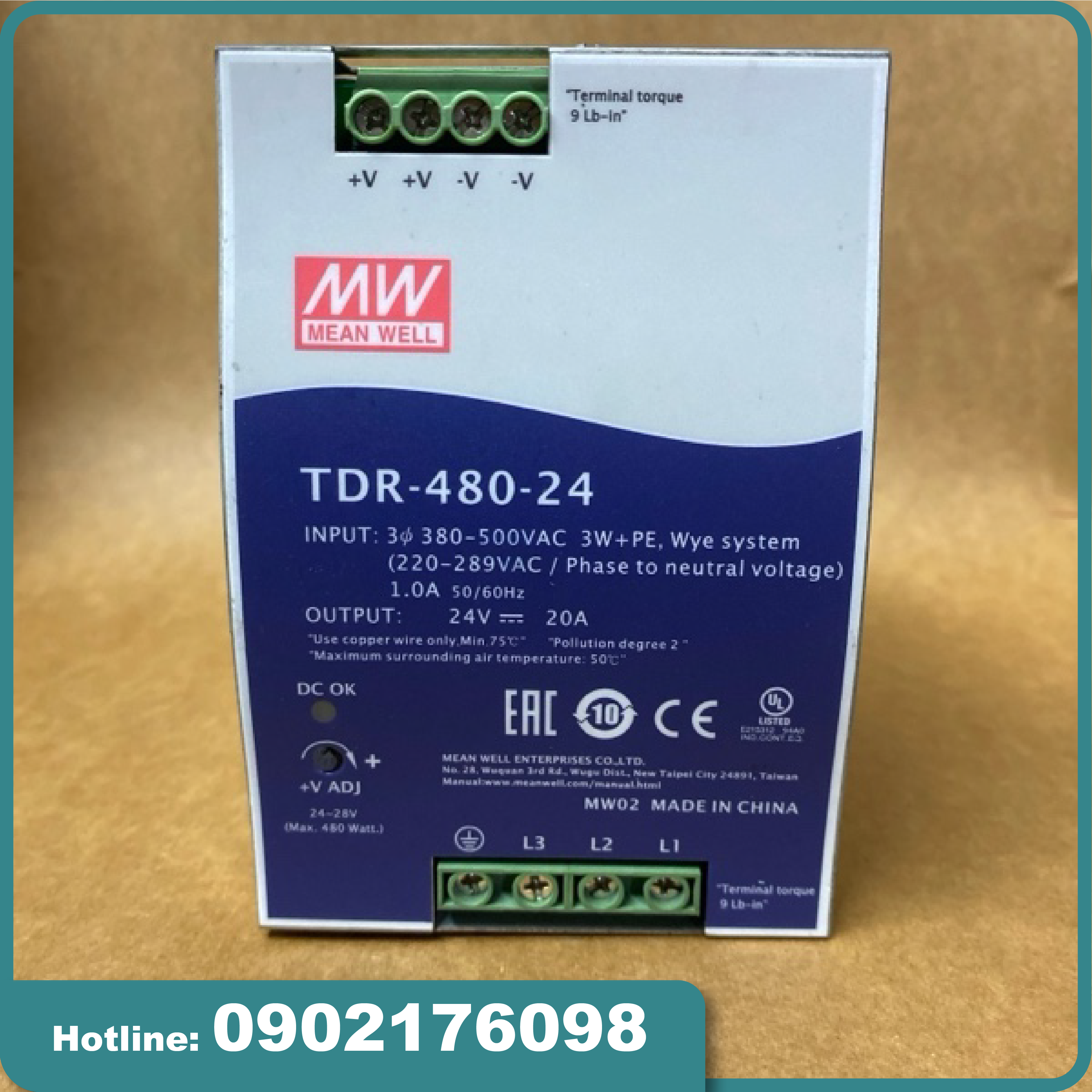Mean Well TDR-480-24 – bộ nguồn công nghiệp gắn DIN Rail, xuất xứ Đài Loan, đầu ra 24VDC – 20A, công suất 480W, hiệu suất 93%, hoạt động ổn định trong môi trường -30~70°C, được ứng dụng rộng rãi trong tủ điều khiển, hệ thống tự động hóa, robot và dây chuyền sản xuất.