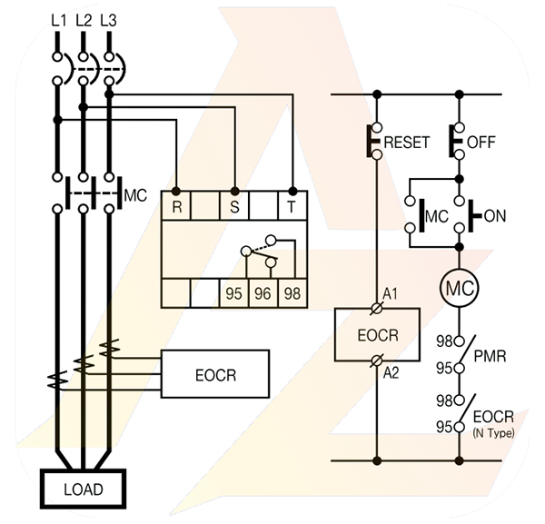 Các pha đầu vào ổn định 95-96 mở (Sử dụng để xuất tín hiệu báo lỗi) 95-98 đóng (Sử dụng để ngắt contactor hoặc thiếu bị điều khiển) |